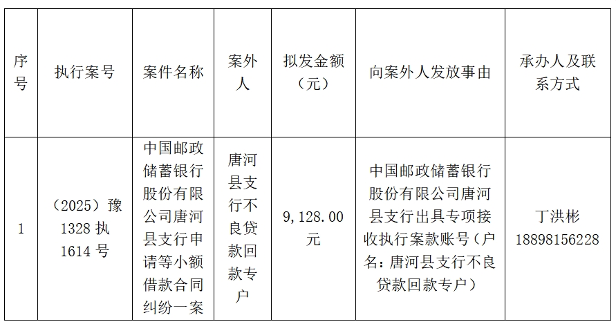 为进一步规范执行案款收发、管理,完善执行案款管理工作,维护当事人合法权益,防患廉政风险,现将唐河县人民法院拟向案外人发放的案款公示如下: