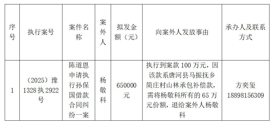 唐河县人民法院关于向案外人发放案款案件的公示