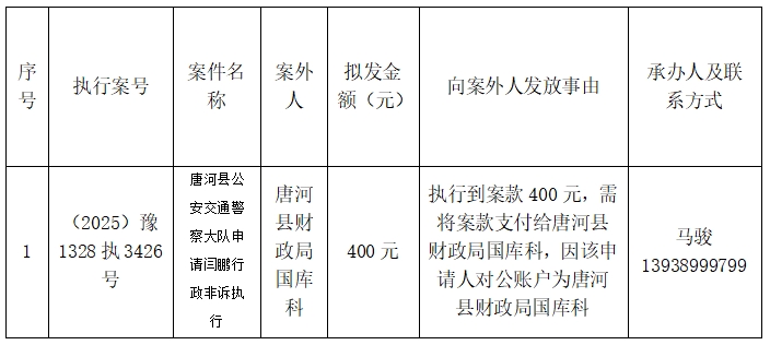 为进一步规范执行案款收发、管理,完善执行案款管理工作,维护当事人合法权益,防患廉政风险,现将唐河县人民法院拟向案外人发放的案款公示如下: