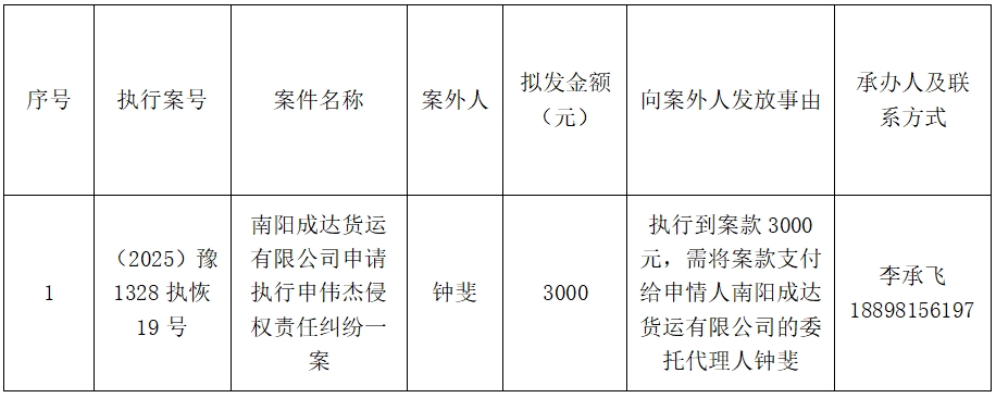 特别提示:公示期满3个自然日后,如无当事人提出异议,则该案款将向案外人发放,监督电话:0377-68955818。